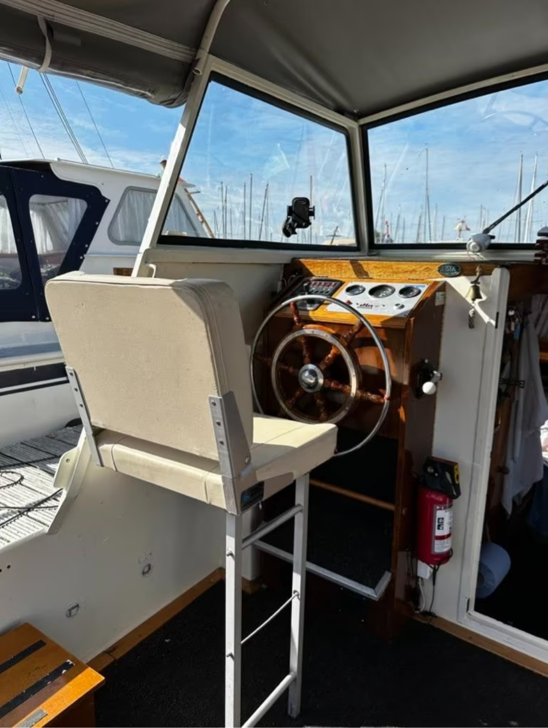 Stuurhut:In de stuurhut zijn 2 opklapbare comfortabele lederen stoelen en achterin bevindt zicht een comfortabele bank, die tevens als extra bed kan worden gebruikt. De tent is volledig vervangen in 2020 en alle naden zijn in juni 2024 opnieuw gestikt. De tent kan volledig dicht maar kan met lekker weer ook helemaal open worden gemaakt.