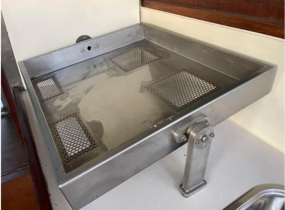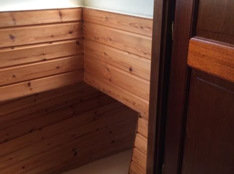 De boot is volledig afgetimmerd (kajuit met keuken, slaapvertrekken, douche, etc.). Ook alle kussens en matrassen zijn inmiddels op maat gesneden zodat deze mooi bekleed kunnen worden in de gewenste stoffering. Naast een koelkast en opbergladen is de keuken voorzien van een solide rvs kookplaathouder met cardanische ophanging en een contragewicht, zodat deze altijd horizontaal blijft (foto 6). Verder biedt de boot slaapplaatsen voor 5 personen (2 vaste slaapkooien, 3 kunnen gemaakt worden van de rondzit in de kajuit). Uiteraard heeft de boot een schoonwatertank, vuilwatertank en een brandstoftank.
