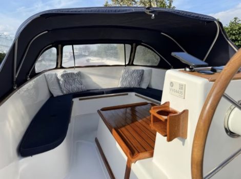 Met heel veel plezier hebben wij de afgelopen jaren gevaren met deze heerlijke sloep. De Makma Vlet combineert uitstekende vaareigenschappen met een robuust, stoer uiterlijk dat de aandacht trekt. Zowel de voorzit als achterzit kunnen omgebouwd worden tot zonnedek. De voorzit is ook groot genoeg om met 2 personen te overnachten. Het voor en achterluik bieden veel opbergruimte, tevens is een degelijk anker met ankerlijn aanwezig.
