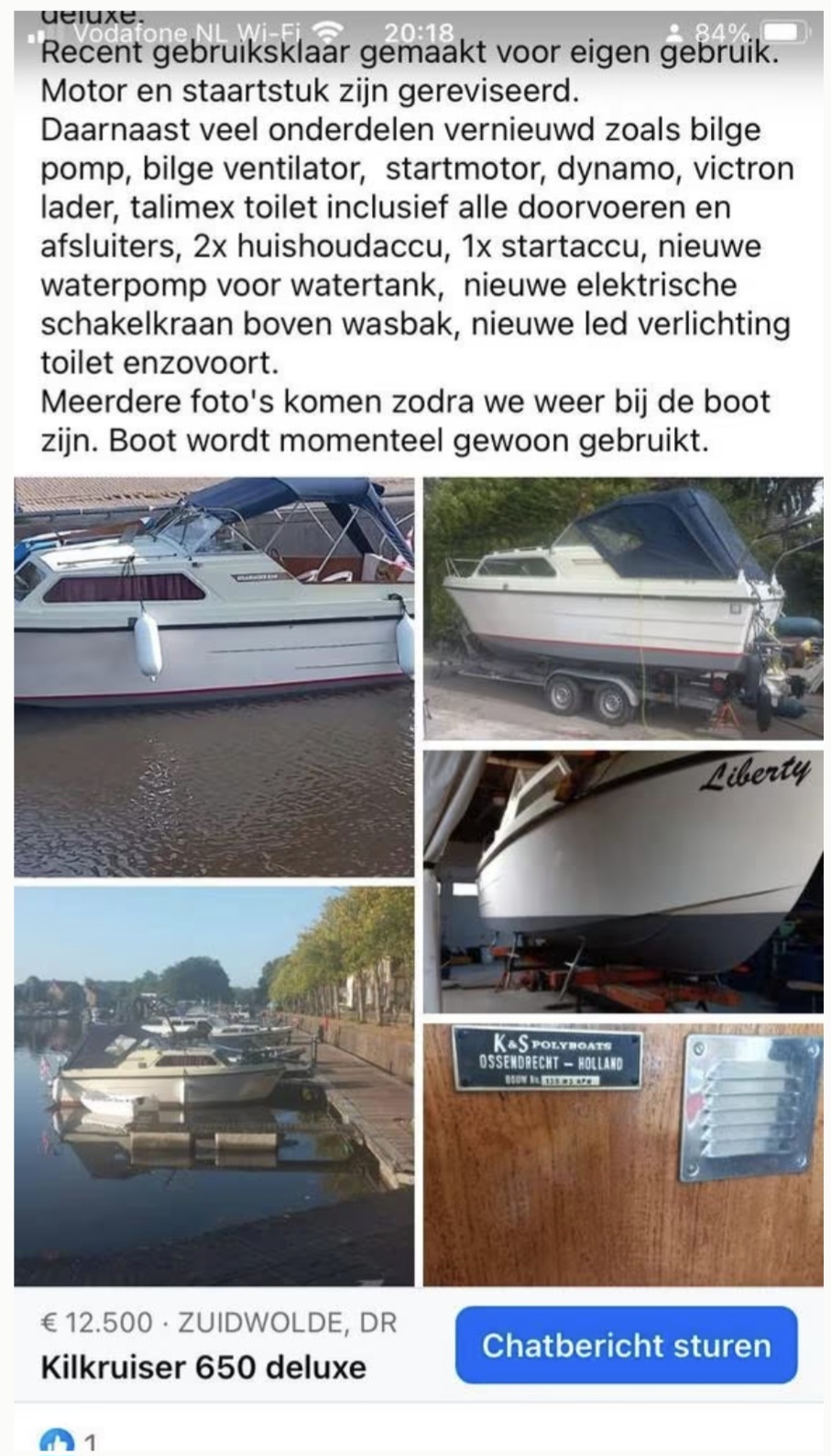 Wegens omstandigheden te koop. Kilkruiser 650 deluxe. Recent gebruiksklaar gemaakt voor eigen gebruik. Motor en staartstuk zijn gereviseerd. Daarnaast veel onderdelen vernieuwd zoals bilge pomp, bilge ventilator, startmotor, dynamo, victron lader, talimex toilet inclusief alle doorvoeren en afsluiters, 2x huishoudaccu, 1x startaccu, nieuwe waterpomp voor watertank, nieuwe elektrische schakelkraan boven wasbak, led verlichting toilet, ruitenwisser motoren, wierpot enzovoort.